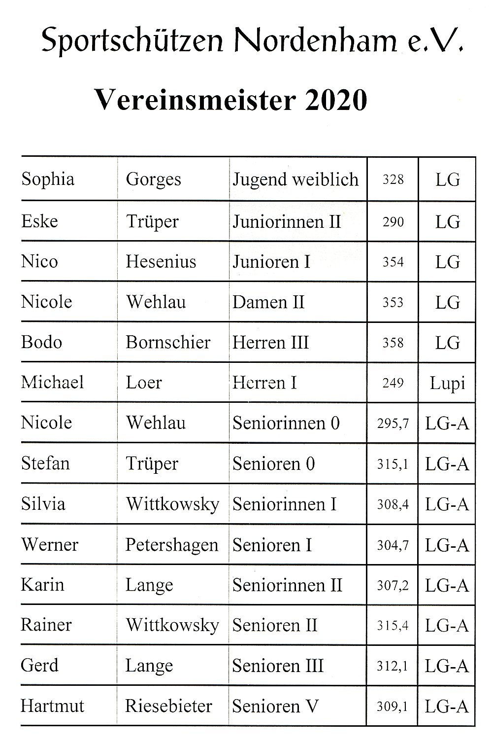 Im Luftgewehrschießen siegten Sophia Gorges (Weibliche Jugend), Eske Trüper (Juniorinnen II), Nico Hesenius (Junioren I), Nicole Wehlau (Damen II) und Bodo Bornschier (Herren III). Beim Luftpistolenschießen gewann Michael Loer (Herren I), und in der Disziplin Luftgewehr-Auflage holten Nicole Wehlau (Seniorinnen 0), Stefan Trüper (Senioren 0), Silvia Wittkowsky (Seniorinnen I), Werner Petershagen (Senioren I), Karin Lange (Seniorinnen II), Rainer Wittkowsky (Senioren II), Gerd Lange (Senioren III) und Hartmut Riesebieter (Senioren V) den Sieg.